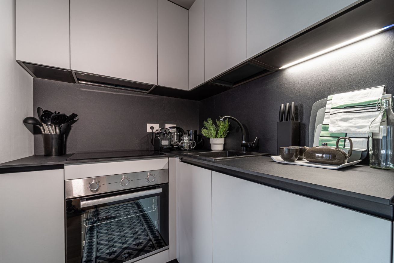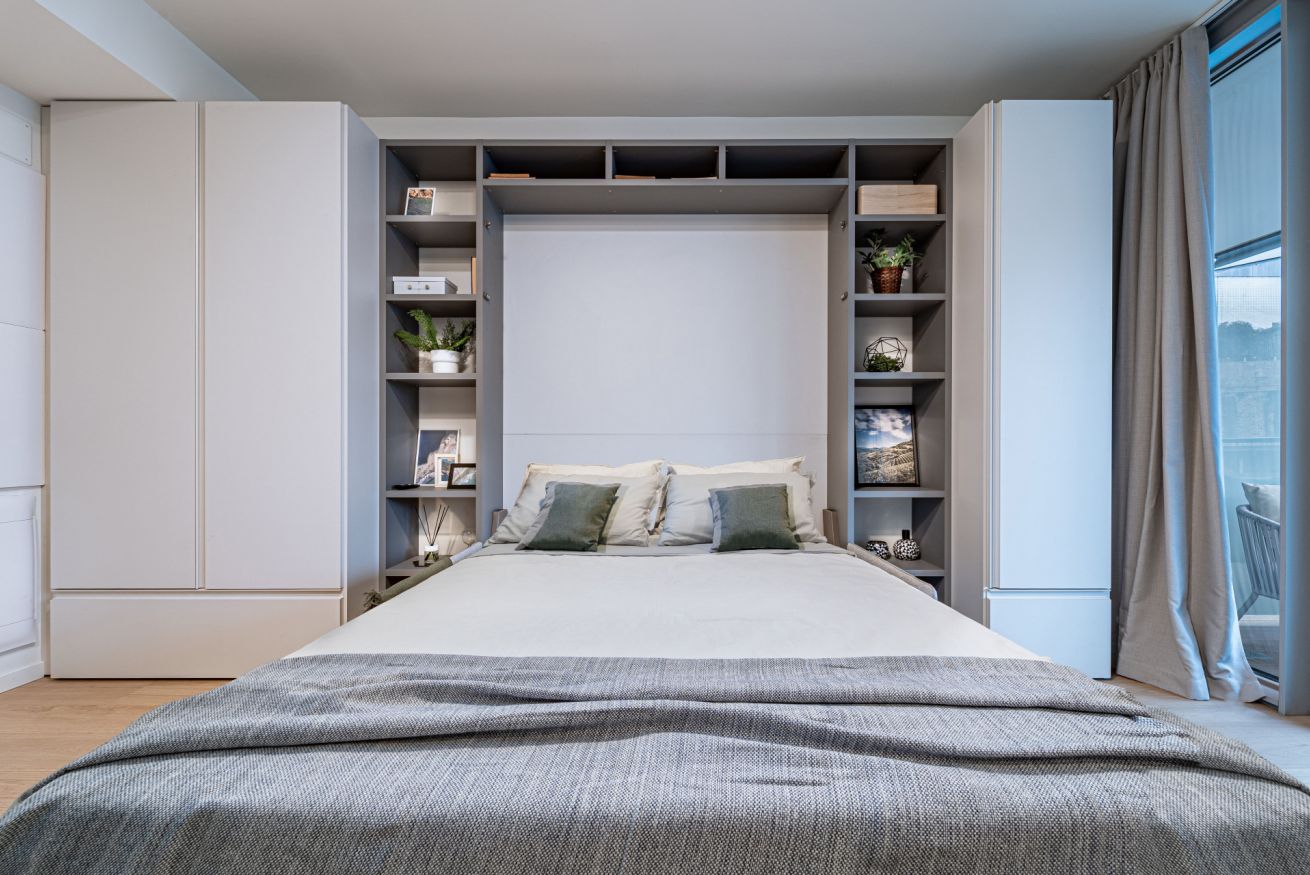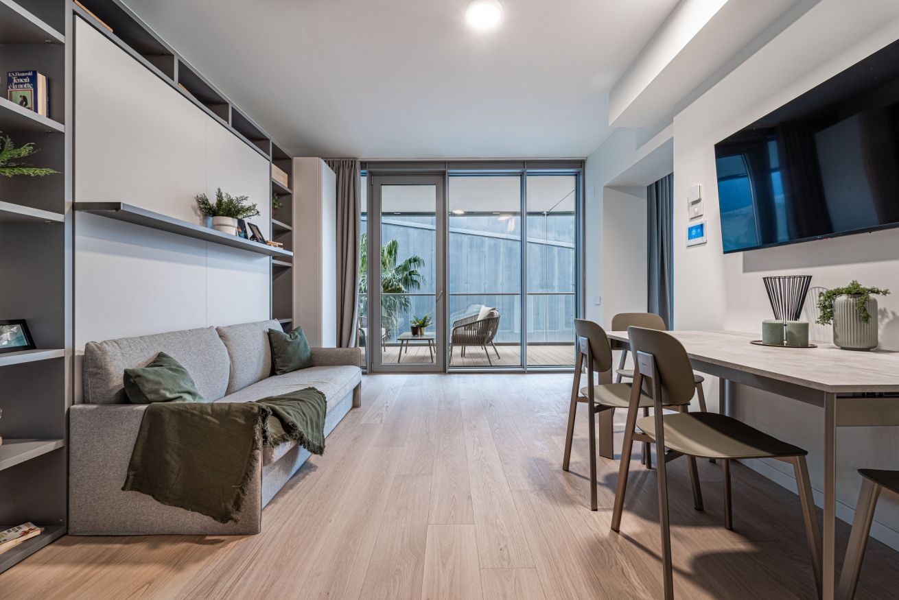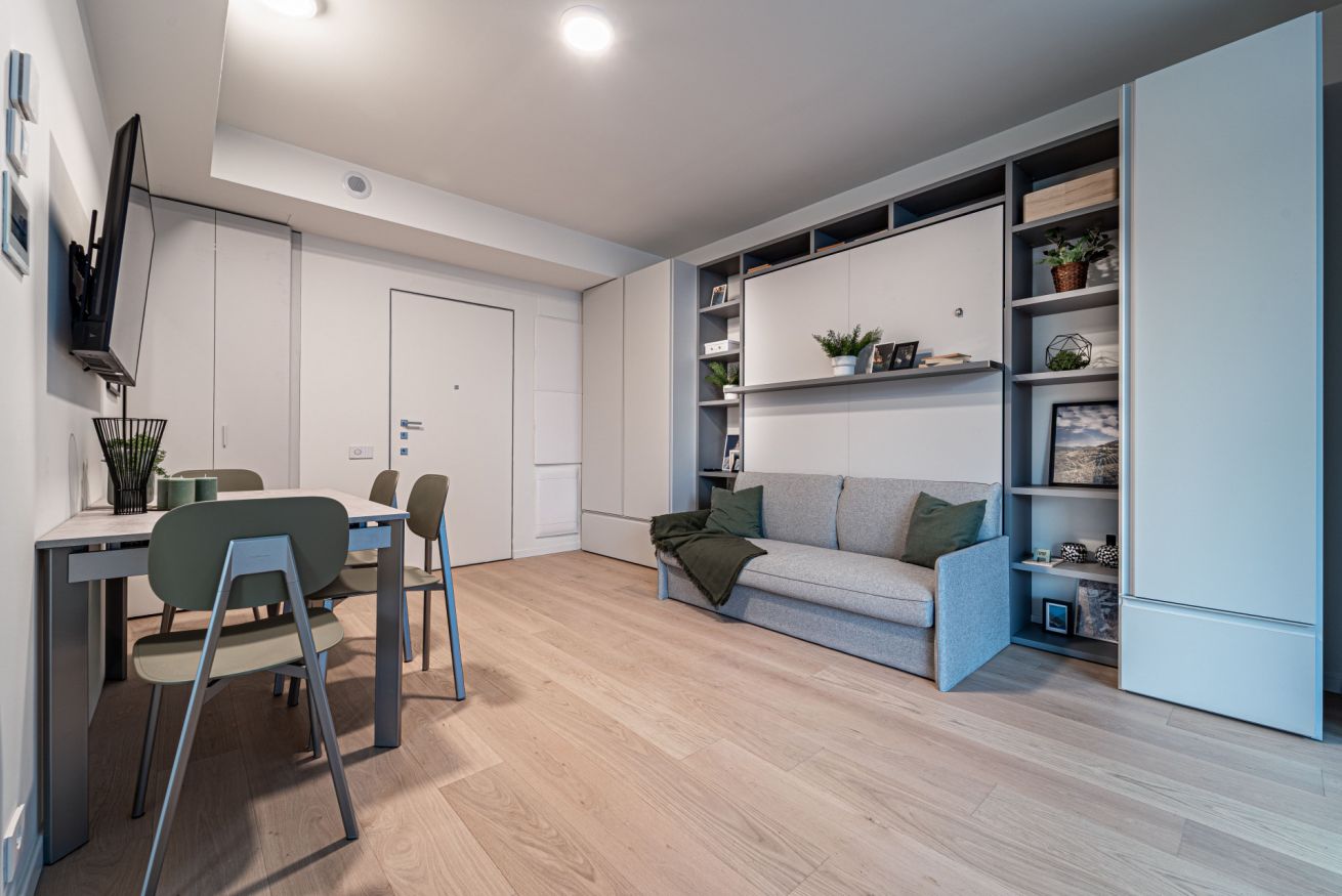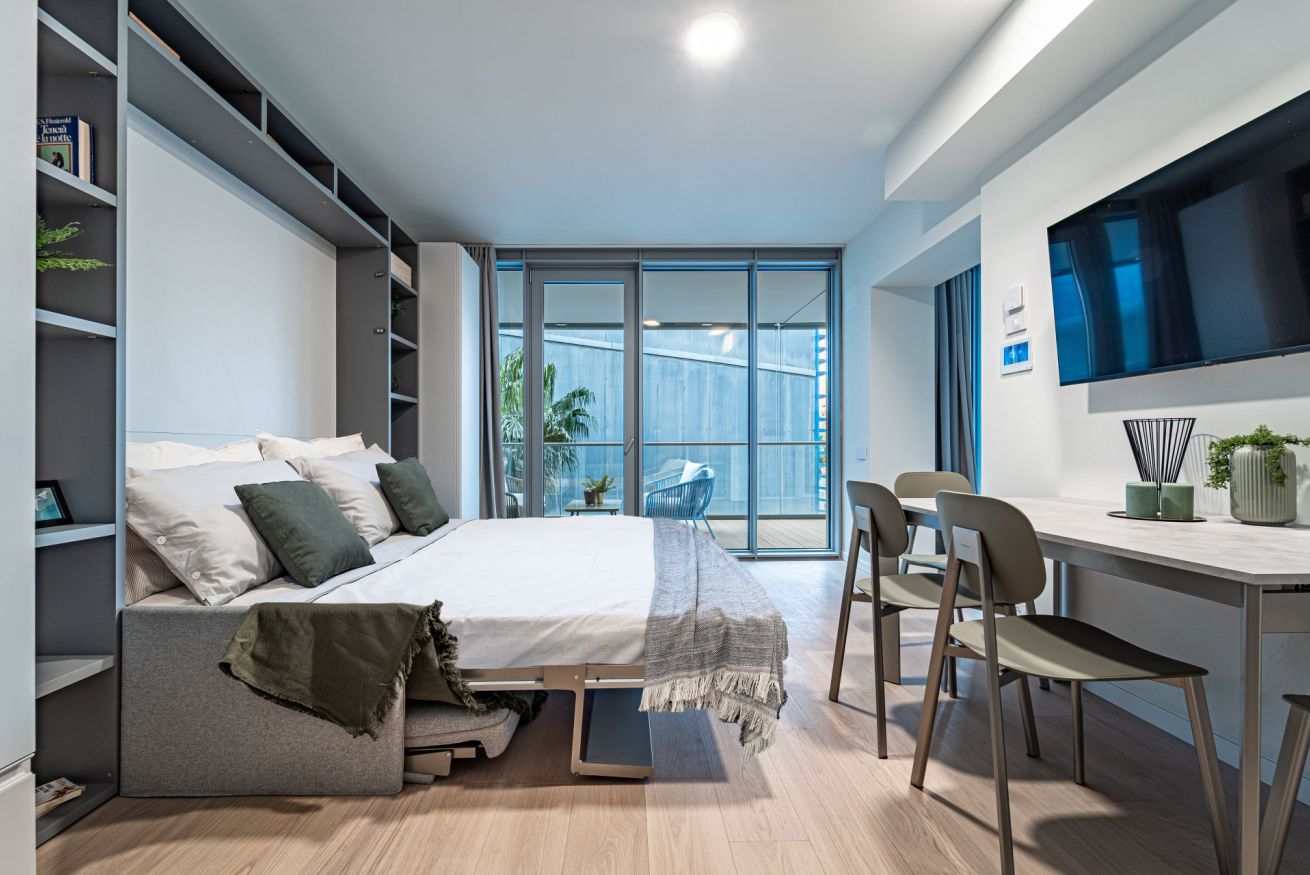 ⭐ The studio includes a double Murphy bed (160×190 cm) that folds down over the sofa, maximizing space and comfort