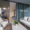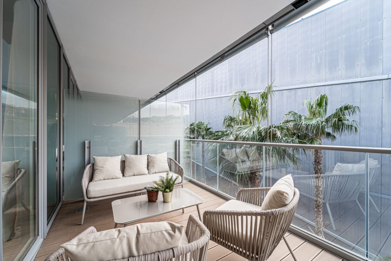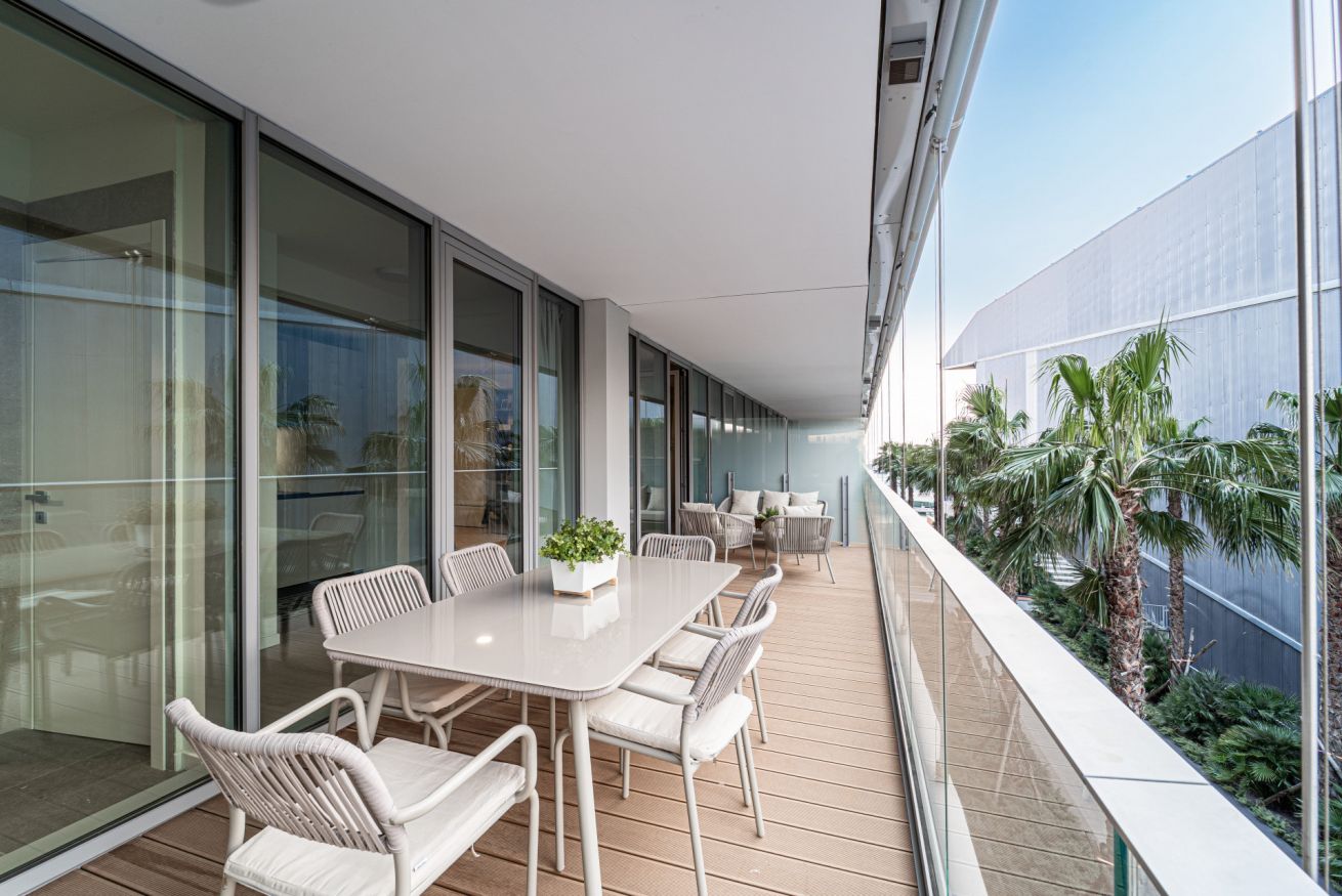 ⭐ Spacious balcony furnished with a dining and a seating area